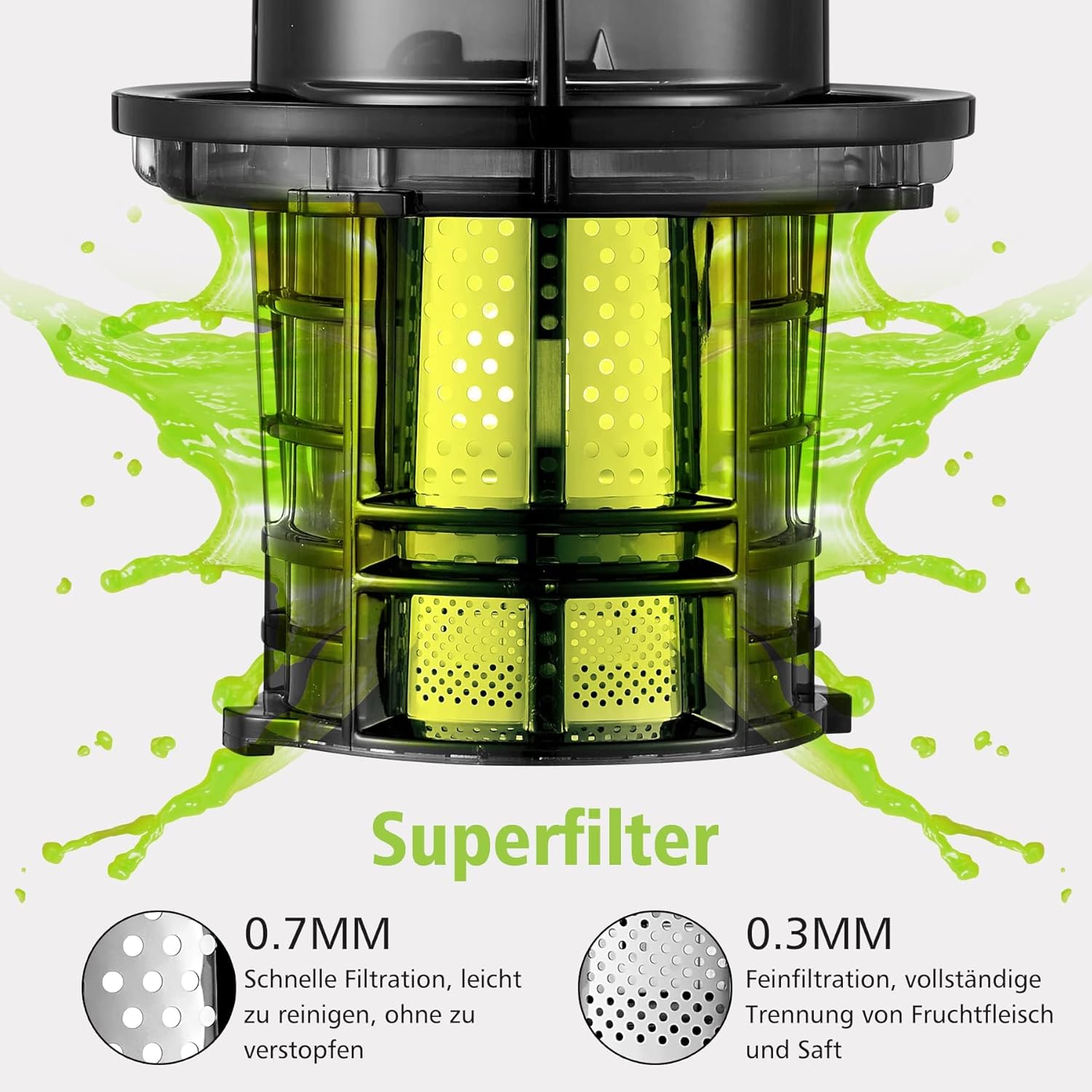 Didesnė maistinė vertė – lėto spaudimo technologija užtikrina mažesnę oksidaciją, išsaugant maksimalų vitaminų ir maistinių medžiagų kiekį. Puikiai tinka įvairiems vaisiams ir daržovėms, tokiems kaip apelsinai, obuoliai, morkos, citrinos, salierai ir kt.