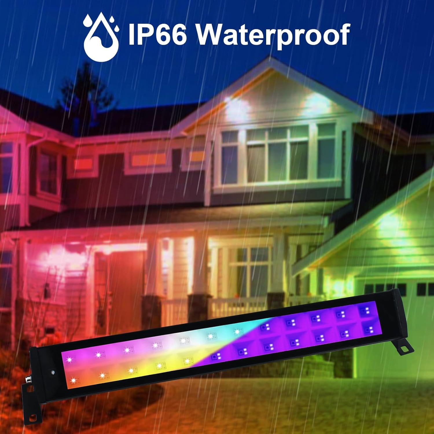 Atsparus vandeniui (IP66): dėl IP66 atsparumo vandeniui, RGB LED sienų prožektorių galima naudoti blogomis oro sąlygomis – lietuje ar sniege. Tinka naudoti tiek viduje, tiek lauke. Lengvas montavimas: tvirtas reguliuojamas metalinis laikiklis leidžia prožektorių lengvai montuoti prie lubų ar sienų skirtingais kampais.