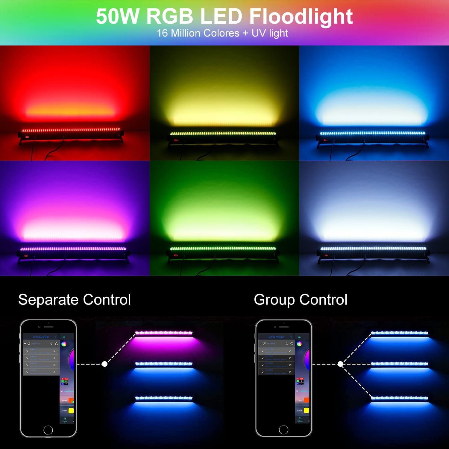 BOSITE RGB ir UV LED prožektorius, 50 W, IP66 atsparus vandeniui, su Bluetooth ir nuotolinio valdymo pulteliu