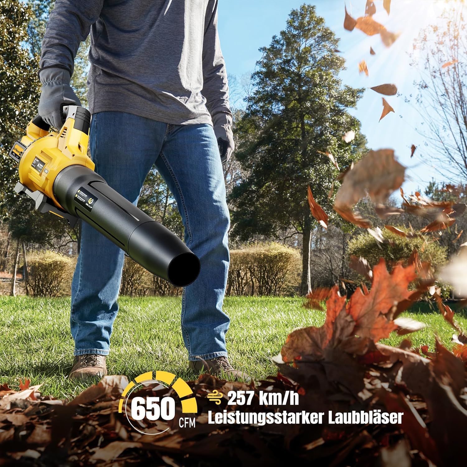 Turbo galia nepriekaištingam sodui: akumuliatorinis lapų pūstuvas naudoja inovatyvią turbinos technologiją ir ašinį ventiliatoriaus dizainą, kad pasiektų iki 257 km/val. vėjo greitį ir įspūdingą 650 CFM oro srautą – net sunkias lapų krūvas ar šlapius lapus lengvai nupučia į šalį.
