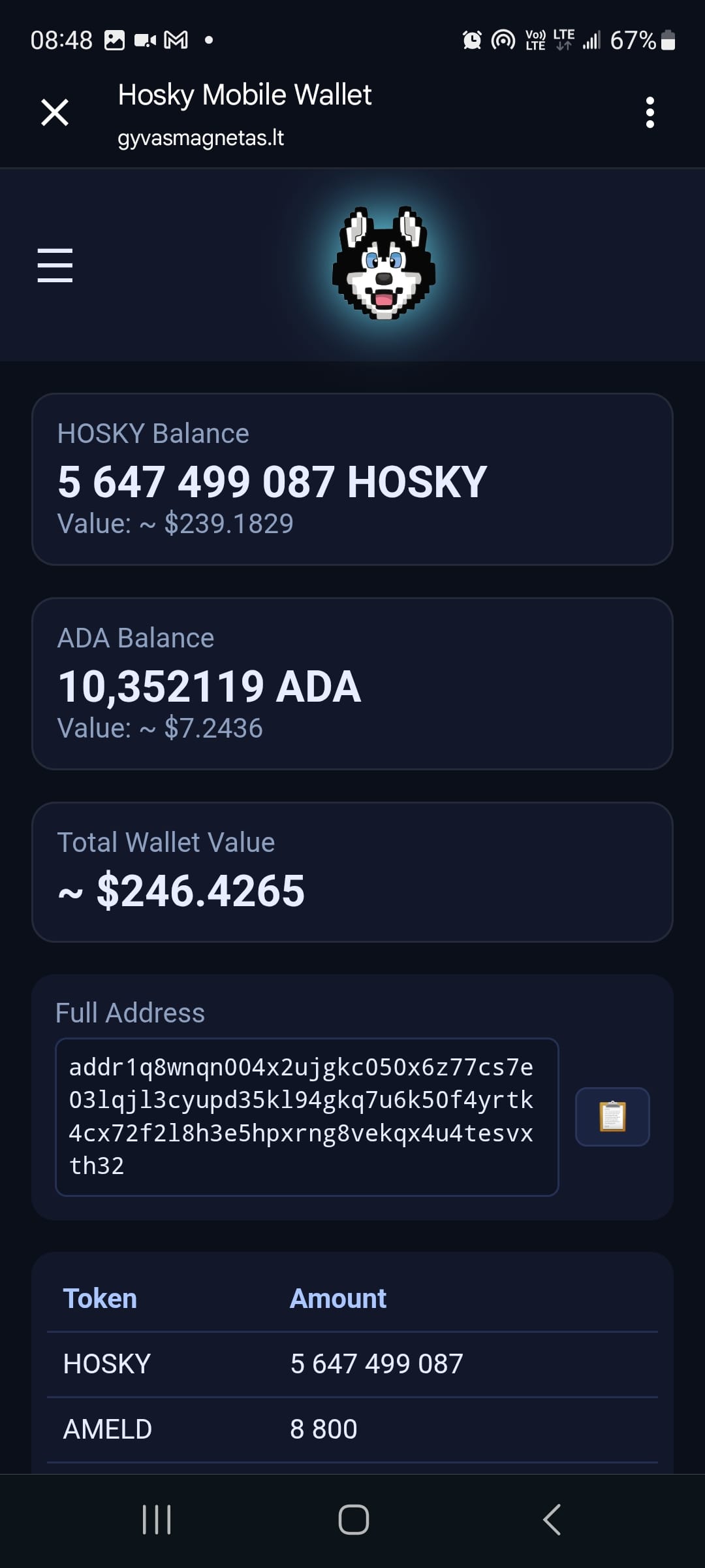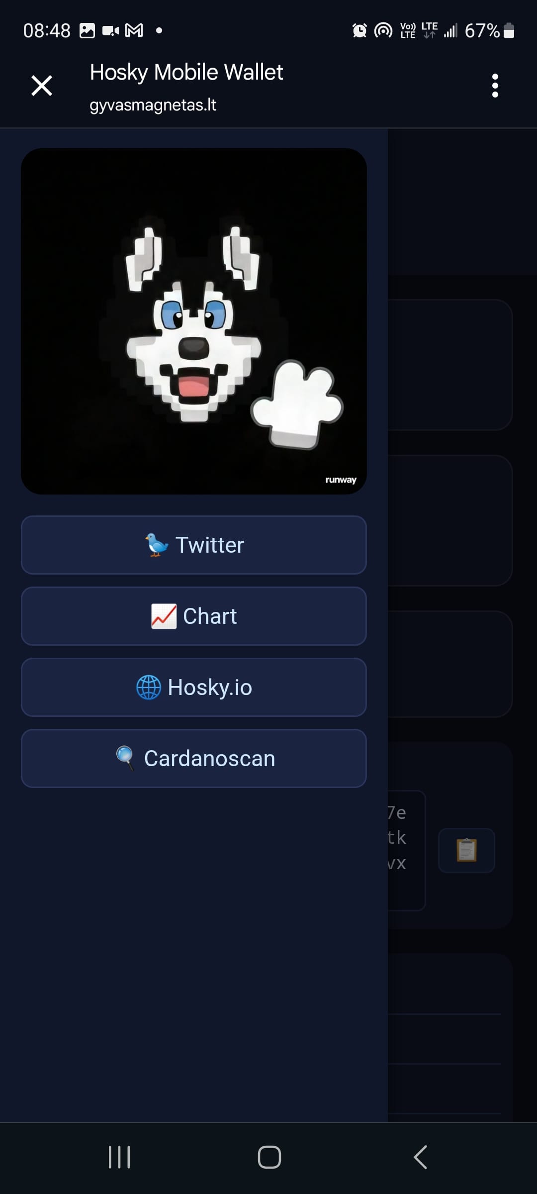 Ekrane pasirodo HOSKY šuniukas su animacija , o kartu atsiveria ir speciali sąsaja tavo Cardano piniginei.