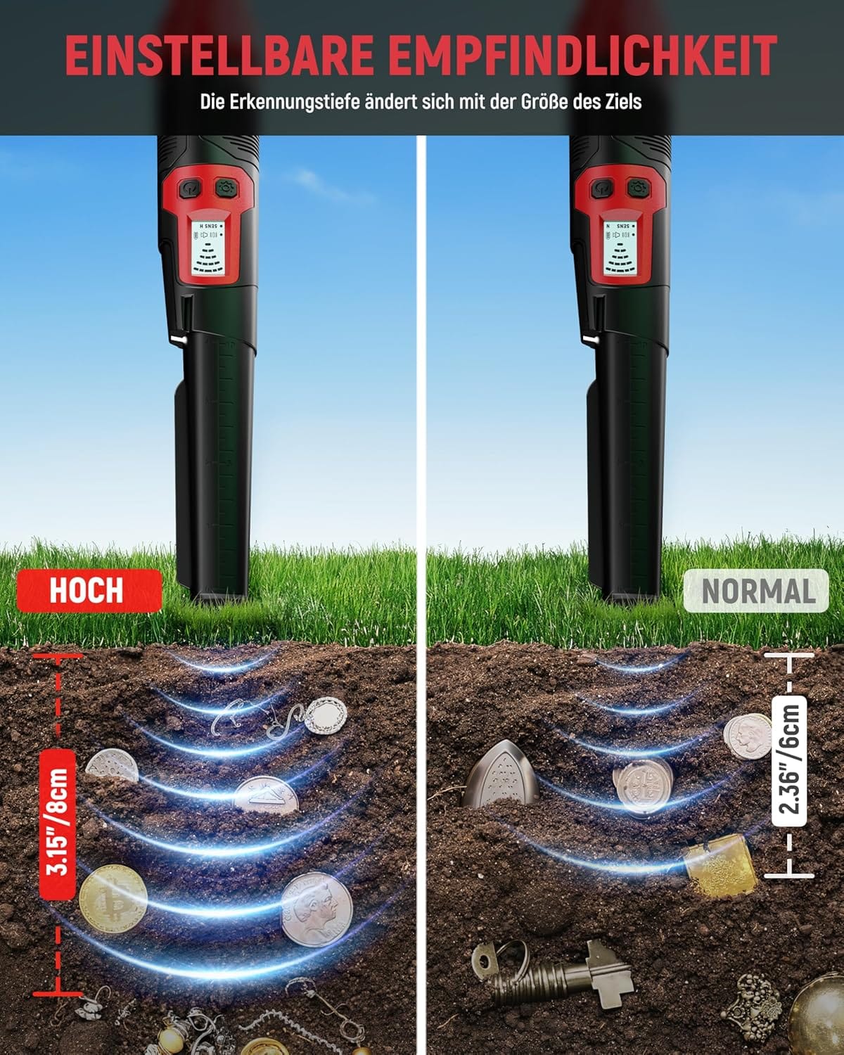 • Aukštas jautrumas: Dvigubas jautrumo režimas užtikrina aptikimą iki 8 cm gylyje, leidžiant surasti net mažus objektus, tokius kaip monetos ar papuošalai.amazon.com.be