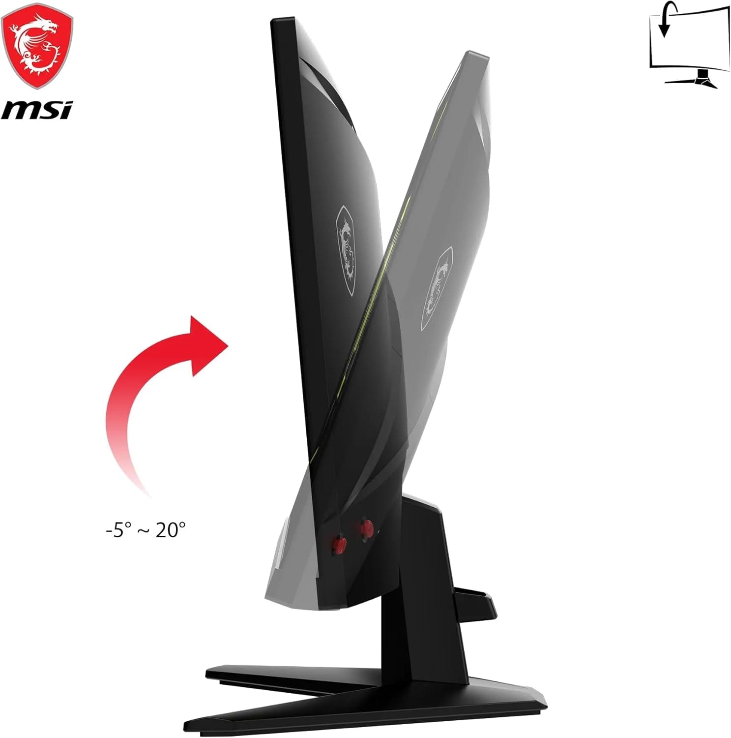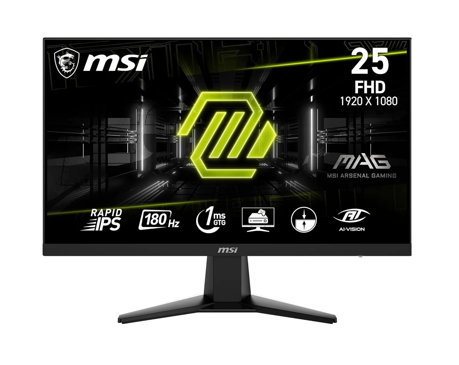 MSI 25 colių FHD 1080p žaidimų monitorius su 16:9 ekrano kraštinių santykiu ir matinio paviršiaus danga, sumažinančia atspindžius. Kontrasto santykis siekia 1000:1, o itin greitas 1 ms atsako laikas ir 180 Hz atnaujinimo dažnis užtikrina sklandų vaizdą. Maksimali raiška – 1920 x 1080.