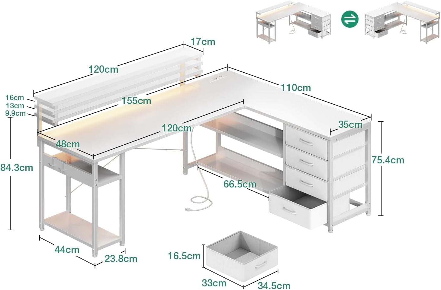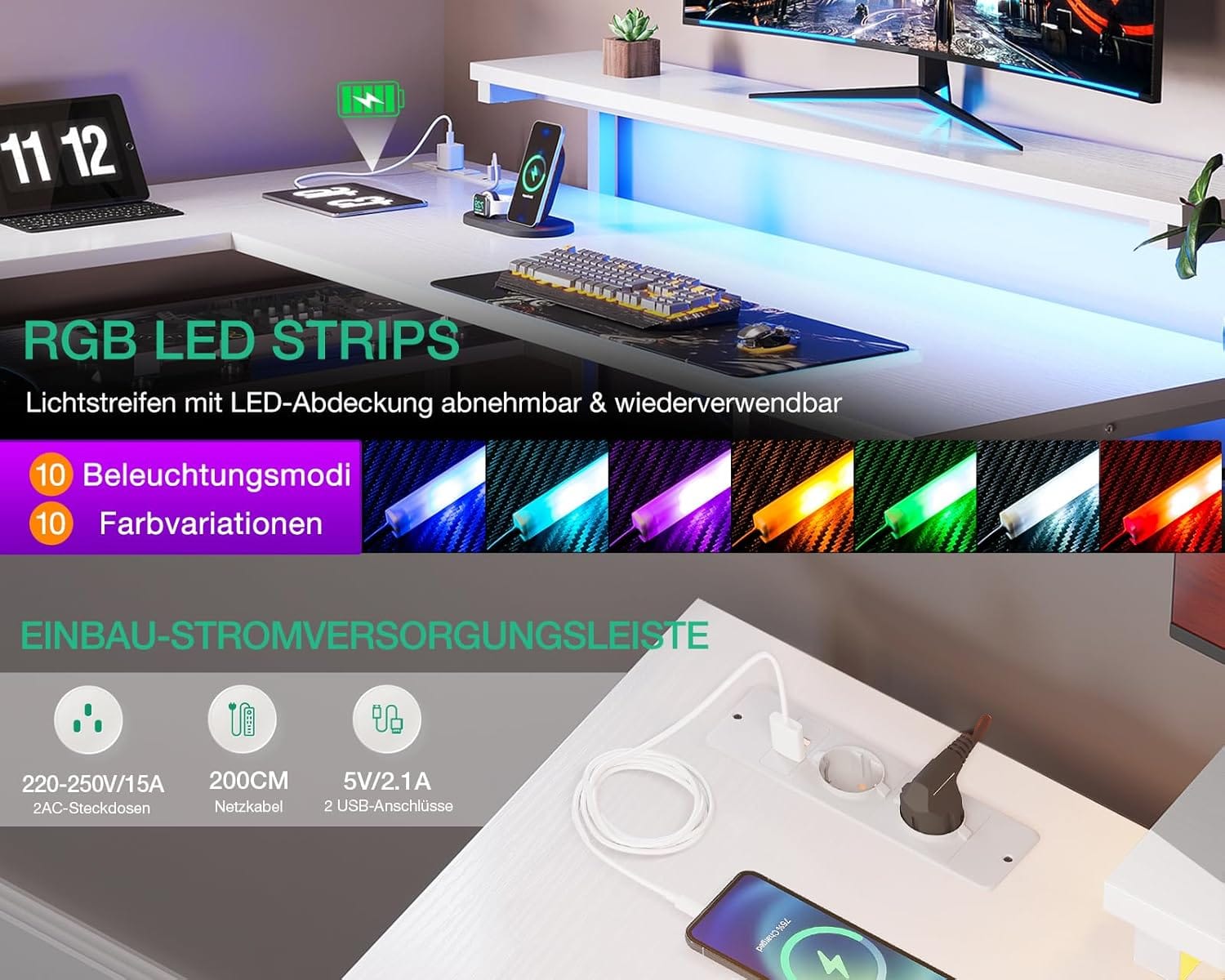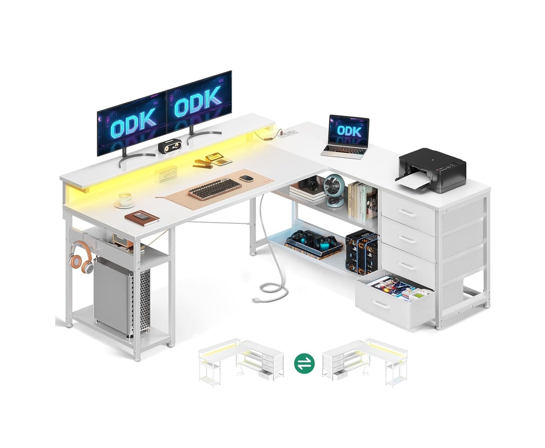 ODK L-formos stalas su elektros lizdais, LED juostomis ir stalčiais (Nežymiai pažeista pakuotė)