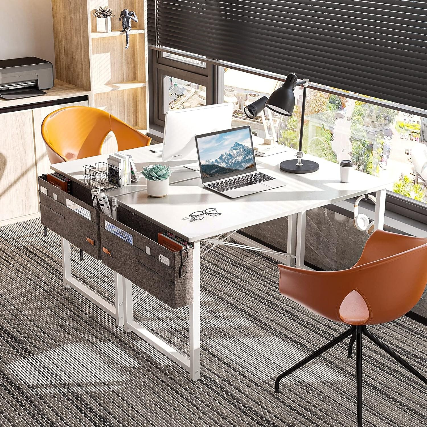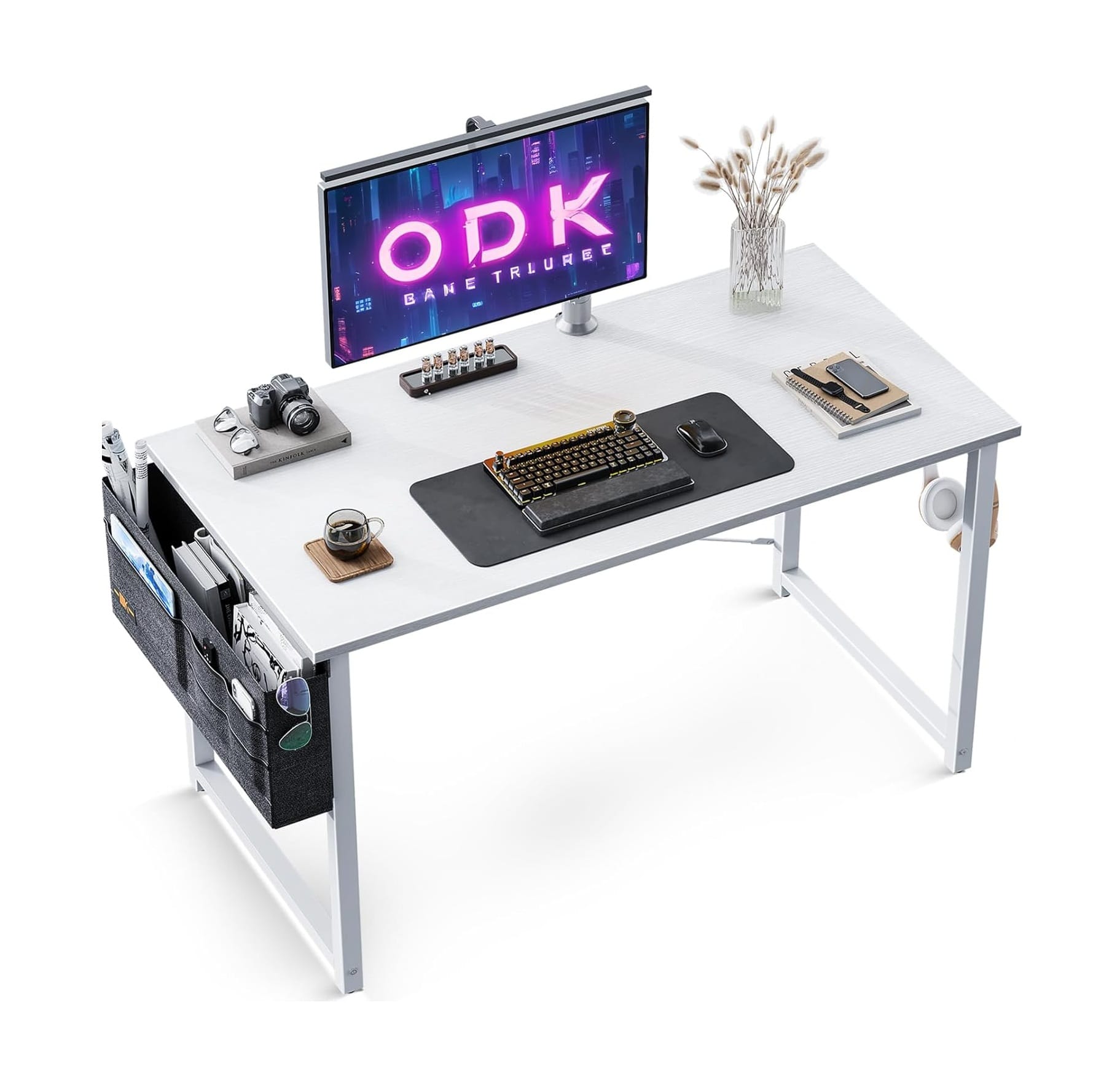 Šis darbo stalas yra su šoniniu laikymo krepšiu ir geležiniu ausinių laikikliu. Laikymo krepšyje galima laikyti žurnalus, dokumentus, knygas ar kitus reikalingus daiktus, taip išlaikant tvarką. Ausinių laikiklis leidžia patogiai pakabinti ausines ar rankinę. Tvarkingas stalas – produktyvus darbas!