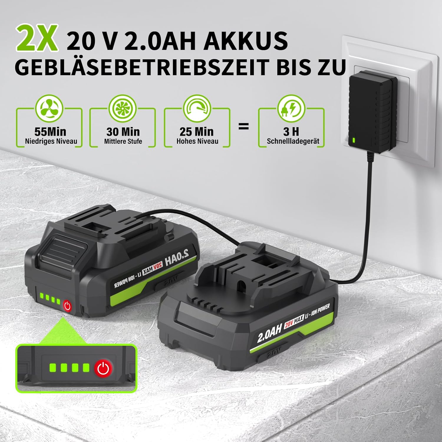 Akumuliatorius: Komplektuojamas su dviem 20V 2.0 Ah baterijomis ir greituoju įkrovikliu. Pilnas įkrovimas trunka apie 3 valandas, suteikiant 25–55 minučių efektyvaus darbo laiką.