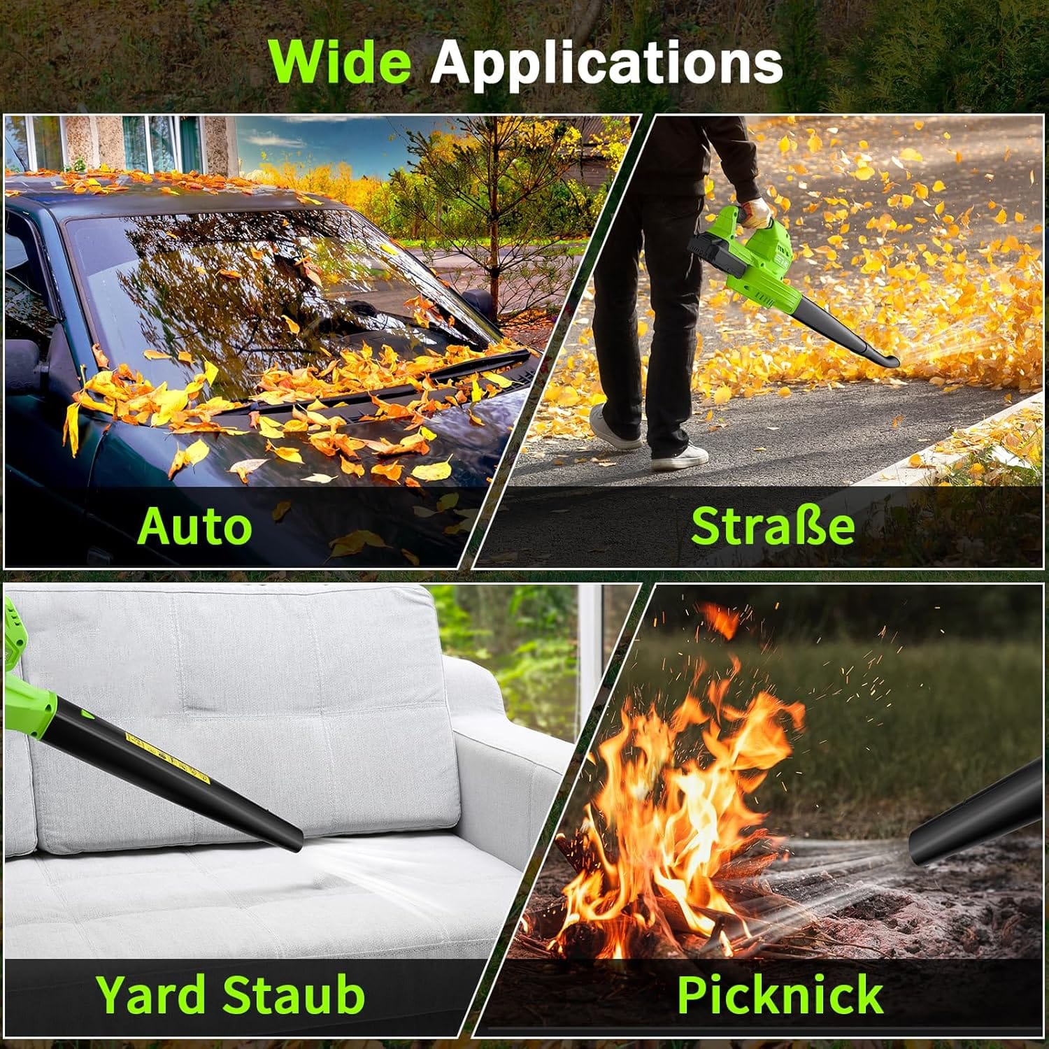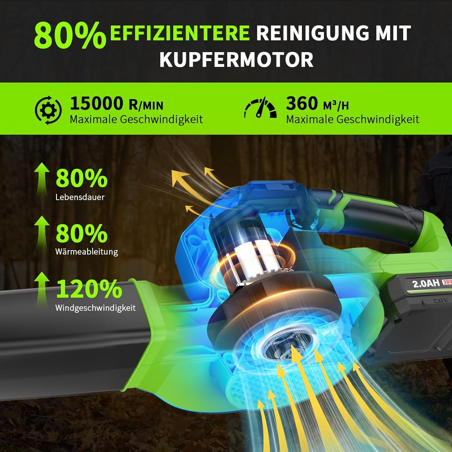 Galingumas: Generuoja stiprią oro srovę iki 120 km/h greičiu, su oro tūriu 360 m³/h. Turbo režimas pasiekia iki 15 000 aps./min, efektyviai pašalindamas lapus, nešvarumus ir dulkes iš sodo, vejos bei kitų lauko erdvių.